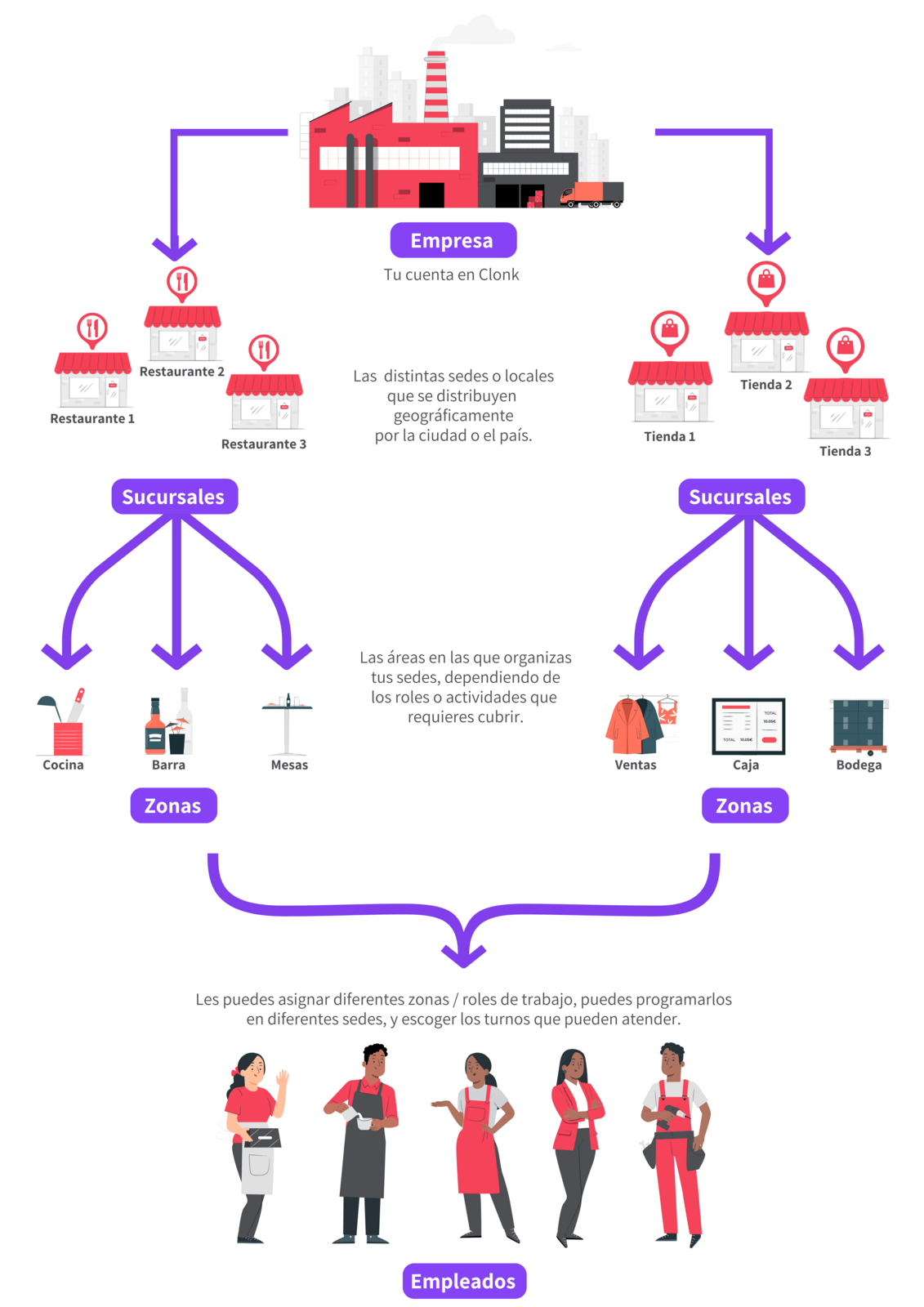 Como administrador de un punto de venta o sucursal, es importante que comprendas la forma como se replica la estructura de tu empresa en Clonk: la distribución de las áreas, los cargos, las personas y los turnos, buscando que todo quede ordenado y las jerarquías se mantengan. En la siguiente imagen te explicamos cómo se replica esta estructura en nuestro sistema: