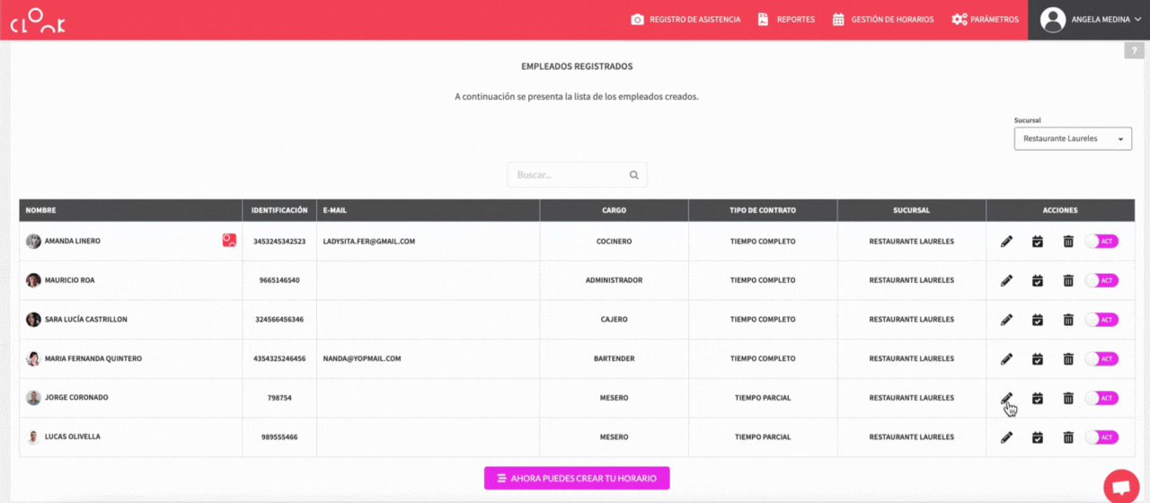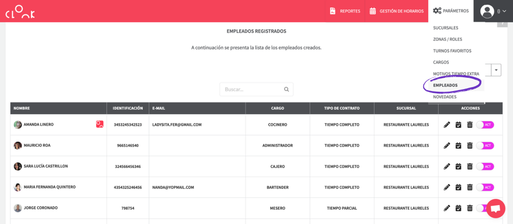Por último, ve al menú Parámetros > Empleados y revisa la lista de personas que tienes en tu sucursal. Si encuentras personas que ya no trabajan en la empresa, o faltan empleados por agregar, contacta a tu líder o al área de gestión humana, ya que son ellos los que cuentan con los permisos para crear o eliminar un empleado de la base de datos.