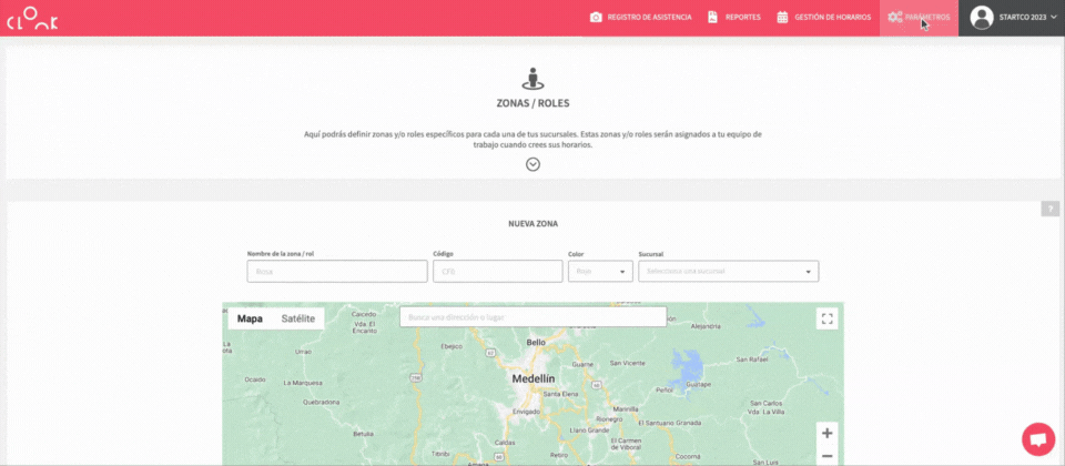 Ve al menú Parámetros > Zonas / Roles y revisa la lista de zonas que hay creadas, puedes editar, eliminar o crear nuevas zonas llenando los datos del formulario: Nombre de la zona, opcionalmente escribe un Código y escoge un Color, elige una Sucursal para crear una zona, si además te aparece un mapa, es porque en tu empresa tienen habilitada la opción de geolocalización y debes escribir la dirección o seleccionar en el mapa la ubicación. No olvides hacer clic en el botón para guardar o crear.