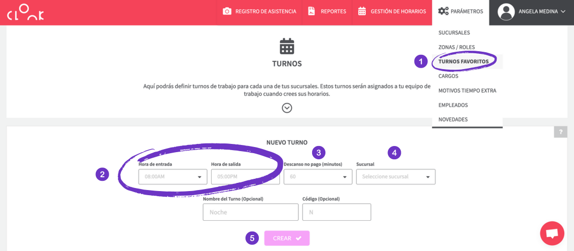 En el mismo menú de parámetros, selecciona la opción turnos favoritos y revisa la lista de turnos que han guardado previamente. La idea es que en esta lista tengas los turnos más usados en los horarios de tu sede, puedes eliminar o agregar nuevos turnos favoritos seleccionando en el formulario la hora de entrada, salida y la duración del descanso o break, si es un turno que no tiene descanso escoge cero "0" minutos. Opcionalmente puedes asignar un nombre al turno y un código. Haz clic en el botón para guardar o crear.
