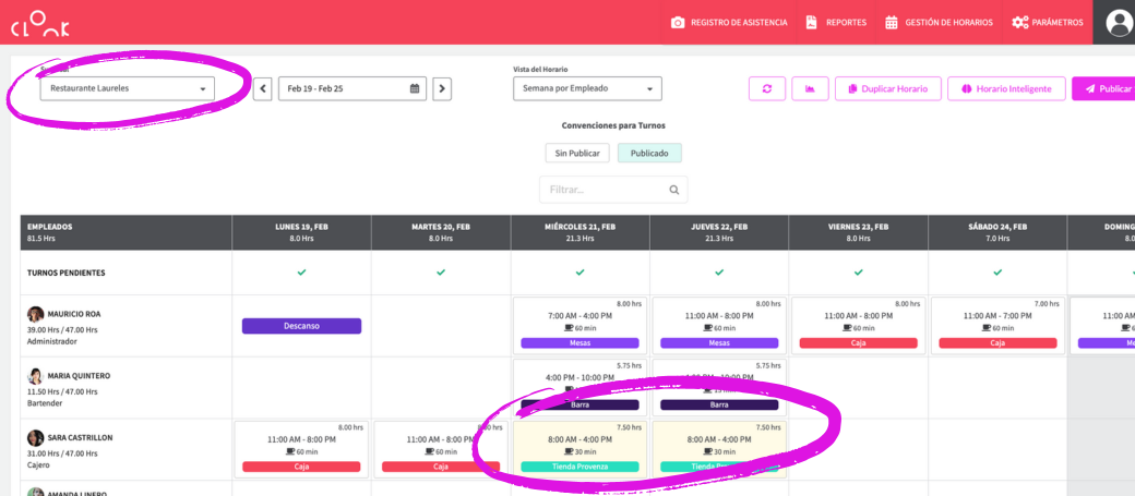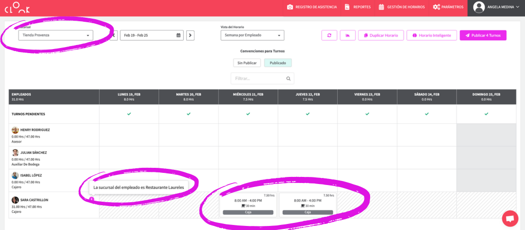 En este caso vemos que desde la sucursal "Restaurante Laureles" le programaron dos turnos a la empleada Sara Castrillón para trabajar en la sucursal "Tienda Provenza".