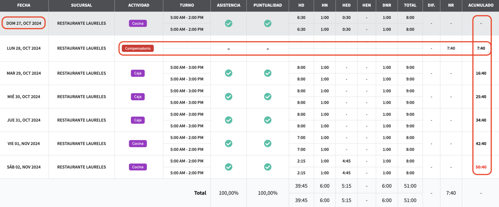 Ejemplo de domingo y compensatorio en Clonk: El empleado laboró el domingo 27 y el compensatorio fue asignado el lunes 28, al observar la columna de tiempo acumulado, podemos ver que este suma para el conteo de horas extras.
