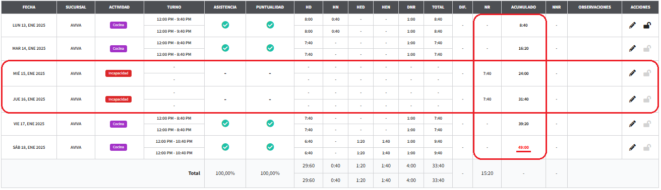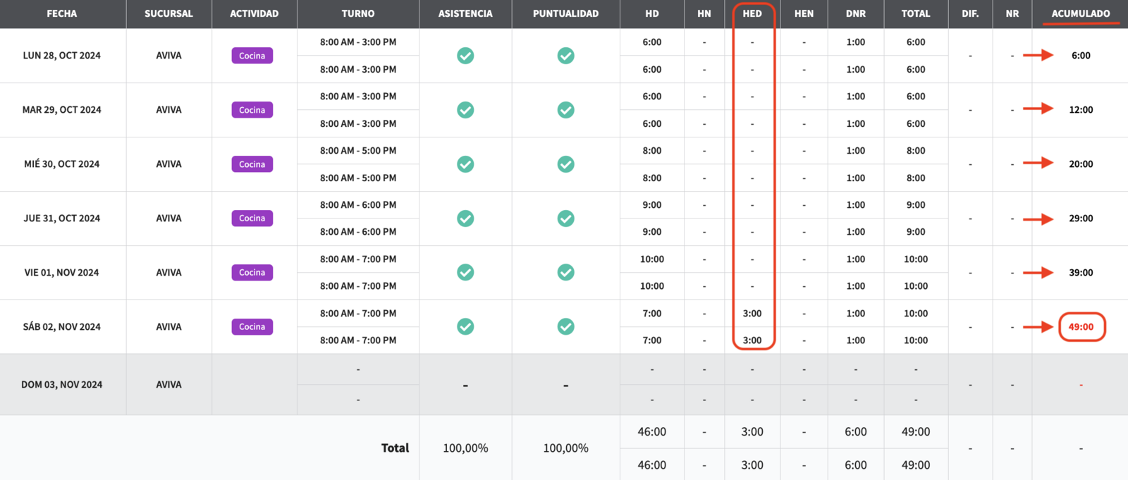 Importante: Considerando el tiempo de la novedad remunerada, este empleado excede las 46 horas semanales, acumulando 6 horas y 40 minutos de tiempo extra. Este tiempo adicional se refleja el viernes 20, ya que las horas extra corresponden al tiempo efectivamente trabajado y no pueden registrarse en el mismo día que ocurre la novedad. Por esta razón, las horas extra se asignan al último día laborado de la semana.