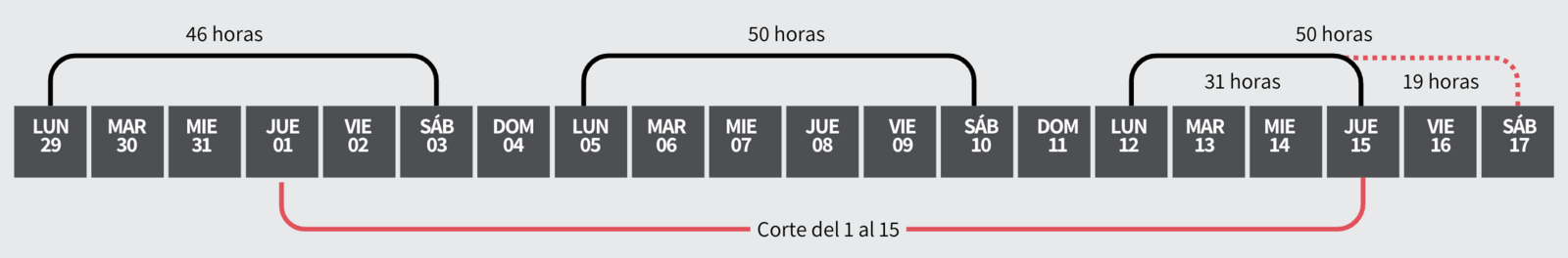 ¿Por qué hay 4 horas extras en la semana 1 del segundo corte? Consideremos la semana del lunes 12 al sábado 17 de agosto. Como el corte de nómina se realiza el jueves 15, el empleado no ha acumulado horas extras hasta ese día, por lo que las horas trabajadas se pagarán como horas ordinarias. Pero para el segundo corte, se calcularán las horas extras teniendo en cuenta el tiempo acumulado desde el lunes 12 hasta el sábado 17. Como esta suma supera las 46 horas, el tiempo adicional se pagará como horas extras.