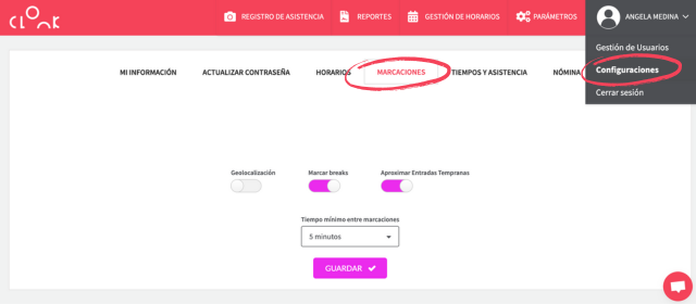 Marcar breaks: Si se desea hacer seguimiento al tiempo de descanso que puede haber en un turno de trabajo, se debe dejar activa esta función y pedirle al empleado que realice las marcaciones adicionales a la salida y regreso de su break. De esta manera podemos validar que la persona efectivamente salió a tomar su descanso, que está tomándose el tiempo que debería y que regresó a tiempo.