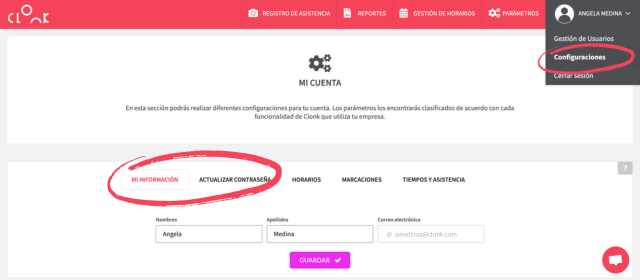 Las dos primeras opciones permiten modificar tu información personal y cambiar tu contraseña de acceso a Clonk. Ambas opciones están disponibles para cualquier tipo de usuario sin importar sus permisos. Las siguientes 3 opciones: Horarios, Marcaciones, y Turnos y Asistencia, solo podrán ser gestionadas por el propietario de cuenta: