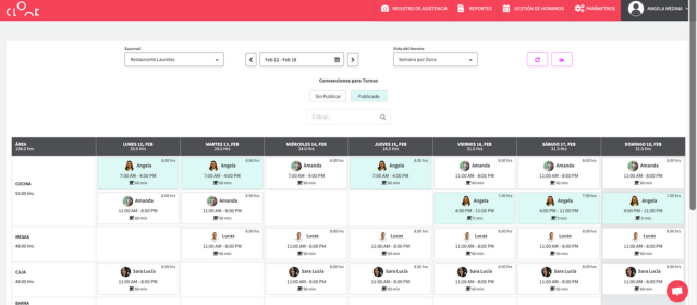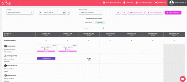 Vista diaria por empleado: muestra la programación de turnos para cada empleado en el día seleccionado. Permite agregar turnos y novedades, mover turnos a través de la función de arrastre y publicarlos.