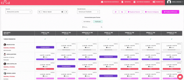 La vista predeterminada que encuentras al abrir la función de Horarios, es la que llamamos "semana por empleado”. Muestra en las columnas los días de la semana y en las filas a los empleados que tienes en la sucursal seleccionada. Permite agregar, editar, borrar, arrastrar y publicar turnos o novedades, usar la opción de copiar y pegar, y programar horarios a través de las funciones de duplicar o el horario inteligente.