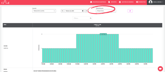 Vista mensual del horario Vista diaria por zona: permite la visualización del número de personas programadas por zona mediante un gráfico de barras, identificando fácilmente los picos donde hay más personas o si queda un vacío a lo largo del día seleccionado.
