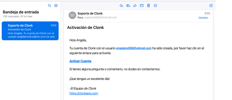 Agregar correo al perfil del empleado Enviar la invitación a un empleado El empleado recibirá el siguiente correo y deberá asignar una contraseña a su cuenta de Clonk haciendo clic en el enlace Activar Cuenta.