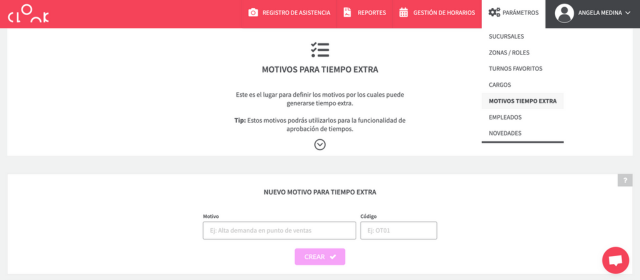 Esos motivos son los que se almacenan en Clonk, para que cuando un empleado trabaje tiempo extra durante su turno, el administrador o supervisor le asigne en el reporte de horas uno de esos motivos, de manera que su líder al revisar tenga clara la razón y pueda decidir fácilmente si aprueba o no las horas extras.