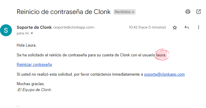 Recibirás un correo con el asunto "Reinicio de contraseña de Clonk" y deberás hacer clic en el enlace que aparece en color azul que dice "Reiniciar contraseña".