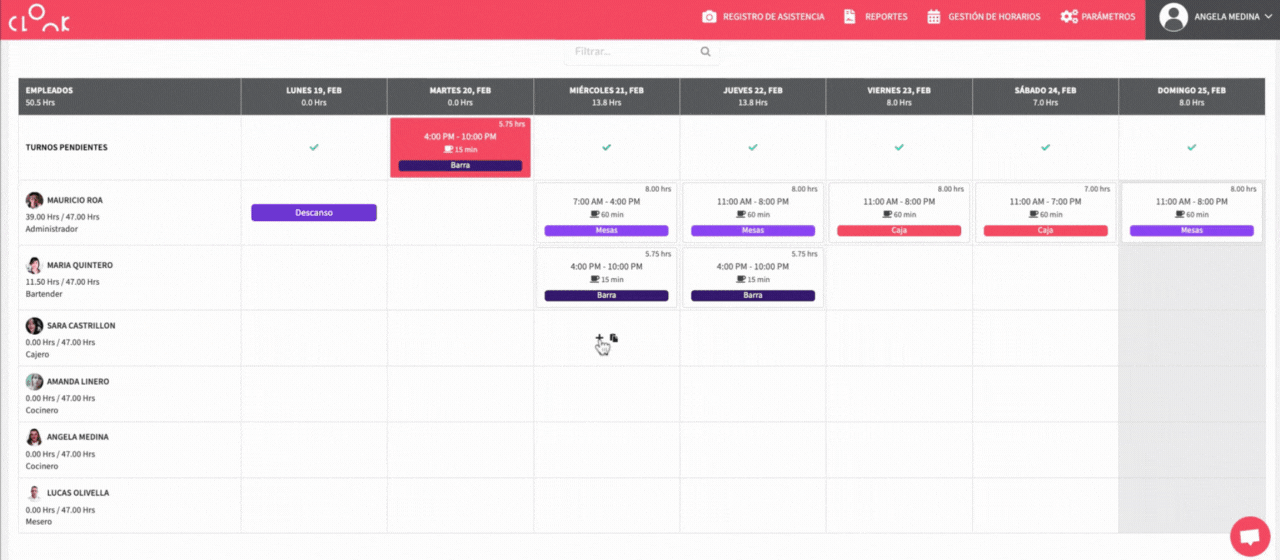 En este caso vemos que desde la sucursal "Restaurante Laureles" le programaron dos turnos a la empleada Sara Castrillón para trabajar en la sucursal "Tienda Provenza".
