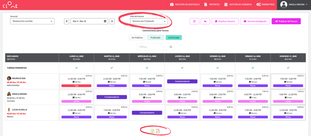 Si deseas descargar tu horario en un formato para imprimir, puedes hacerlo en PDF desde la vista "semana por empleado". Las demás vistas del horario que tenemos disponibles, como la mensual o la diaria, permiten la descarga en un archivo de Excel.