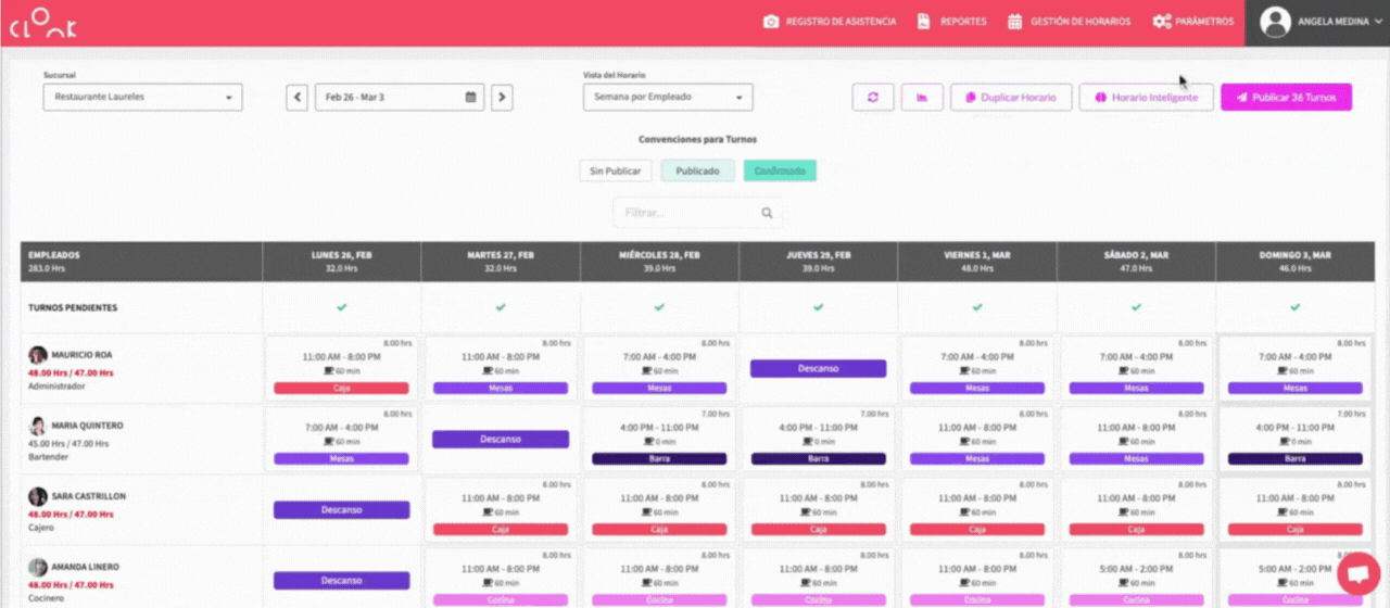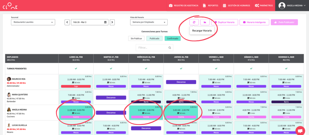 Puedes revisar en el horario los turnos que tus empleados van confirmado, haciendo clic en el botón de "recargar horario". Los turnos que han sido confirmados, cambian a un color verde oscuro y su estado pasa a "confirmado".