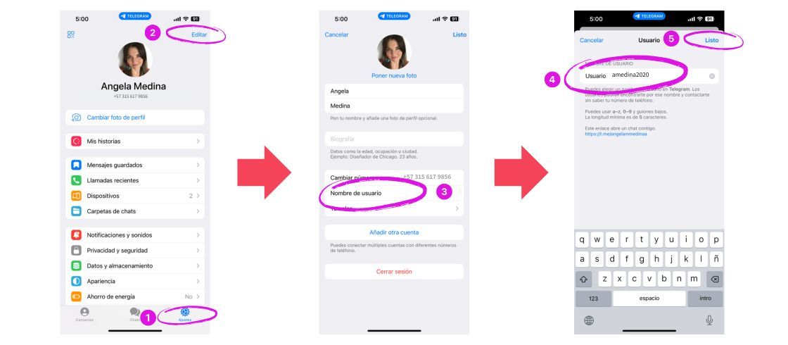 En este caso es necesario que el empleado descargue la aplicación de Telegram, cree una cuenta y asigne un nombre de usuario en el menú editar ajustes de la app.