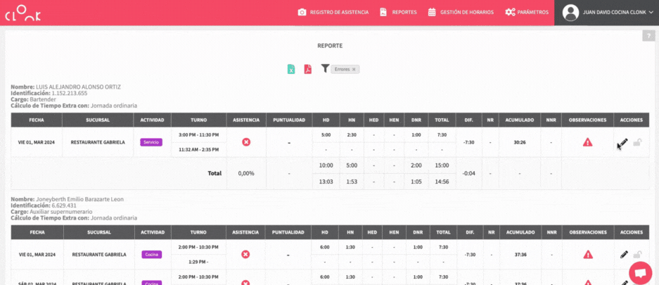 Para garantizar que los cálculos en el reporte de horas sean correctos, es fundamental que revises continuamente tu reporte de horas. Puede ser que día a día entres a verificar alertas o errores, o puedes usar el filtro en el reporte para facilitar el proceso: