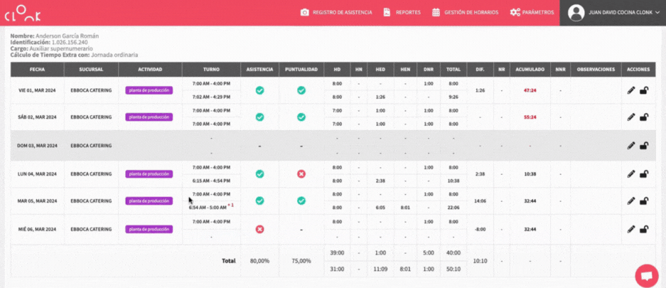 En el reporte se calculan los totales de tiempos y se clasifican de manera automática las categorías de las horas trabajadas de acuerdo con: