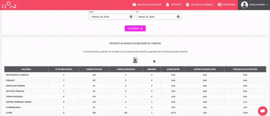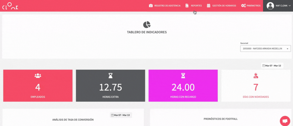 También permite visualizar rápidamente los totales de horas extras para el periodo de tiempo que escojas en cada sucursal, y un promedio de horas extras por empleado. Este promedio permite hacer comparaciones fácilmente de lo que pasa con este indicador de horas extras / empleado en cada una de las sedes, y hacerse preguntas acerca del porqué en tiendas con similares características, pueden darse diferencias importantes en el promedio de horas extras durante un mismo periodo de tiempo.