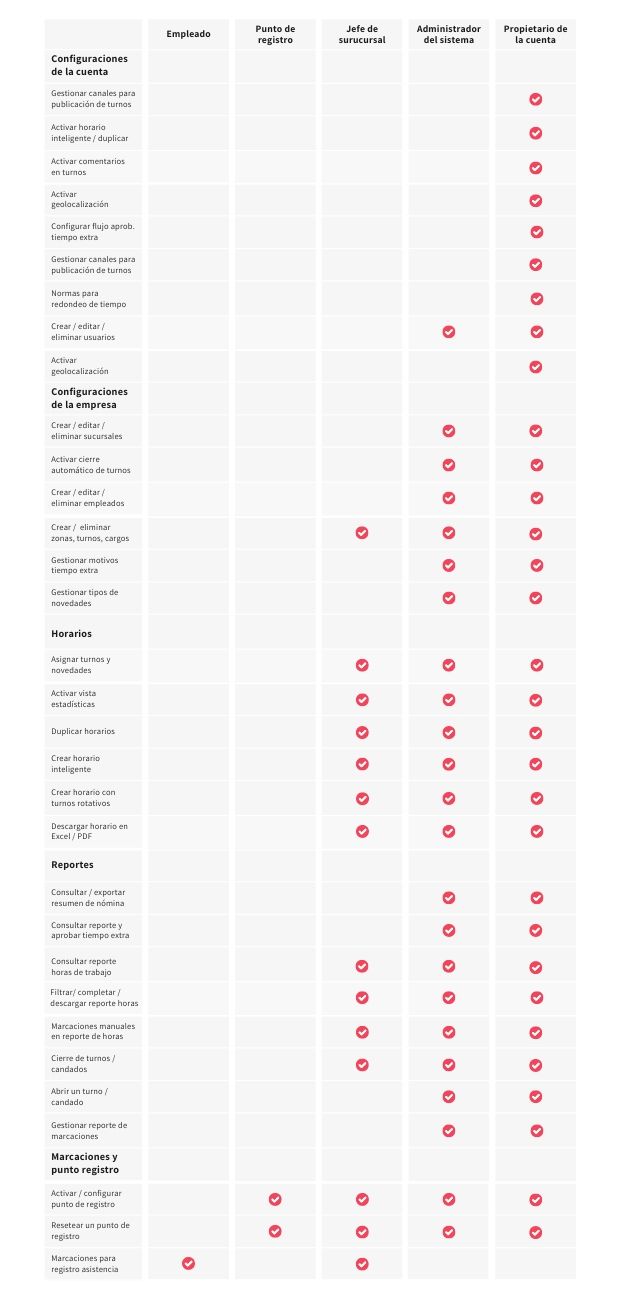 No tienen acceso a las configuraciones de la empresa, ni tampoco a las de la cuenta, por lo tanto, no podrá crear nuevas sucursales, ni agregar o retirar empleados, ni modificar las normas de redondeo de tiempos, puntualidad o geolocalización.